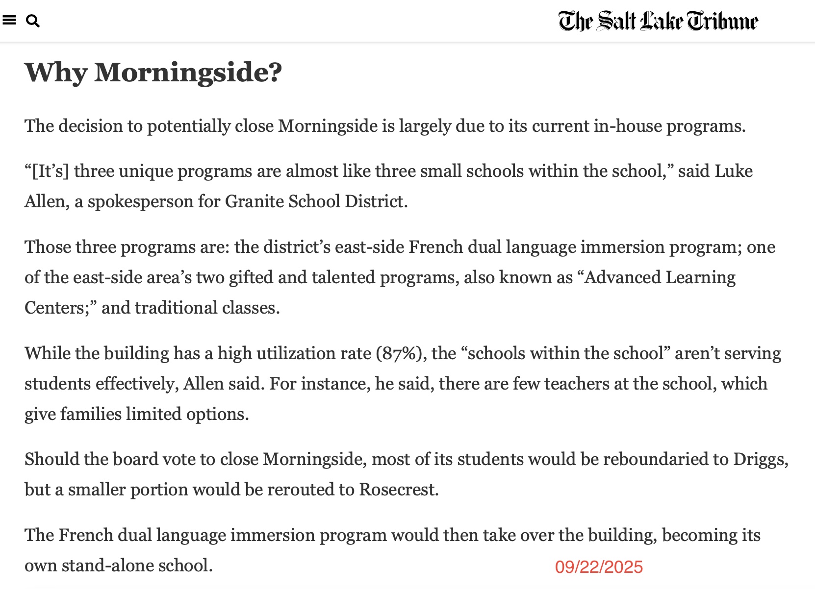 - Why did GSD spokesperson Luke Allen provide a completely different explanation for the recommendation to close Morningside to the Tribune (see the article on sltrib.com and a screenshot) than the explanation the PAC gave to parents?